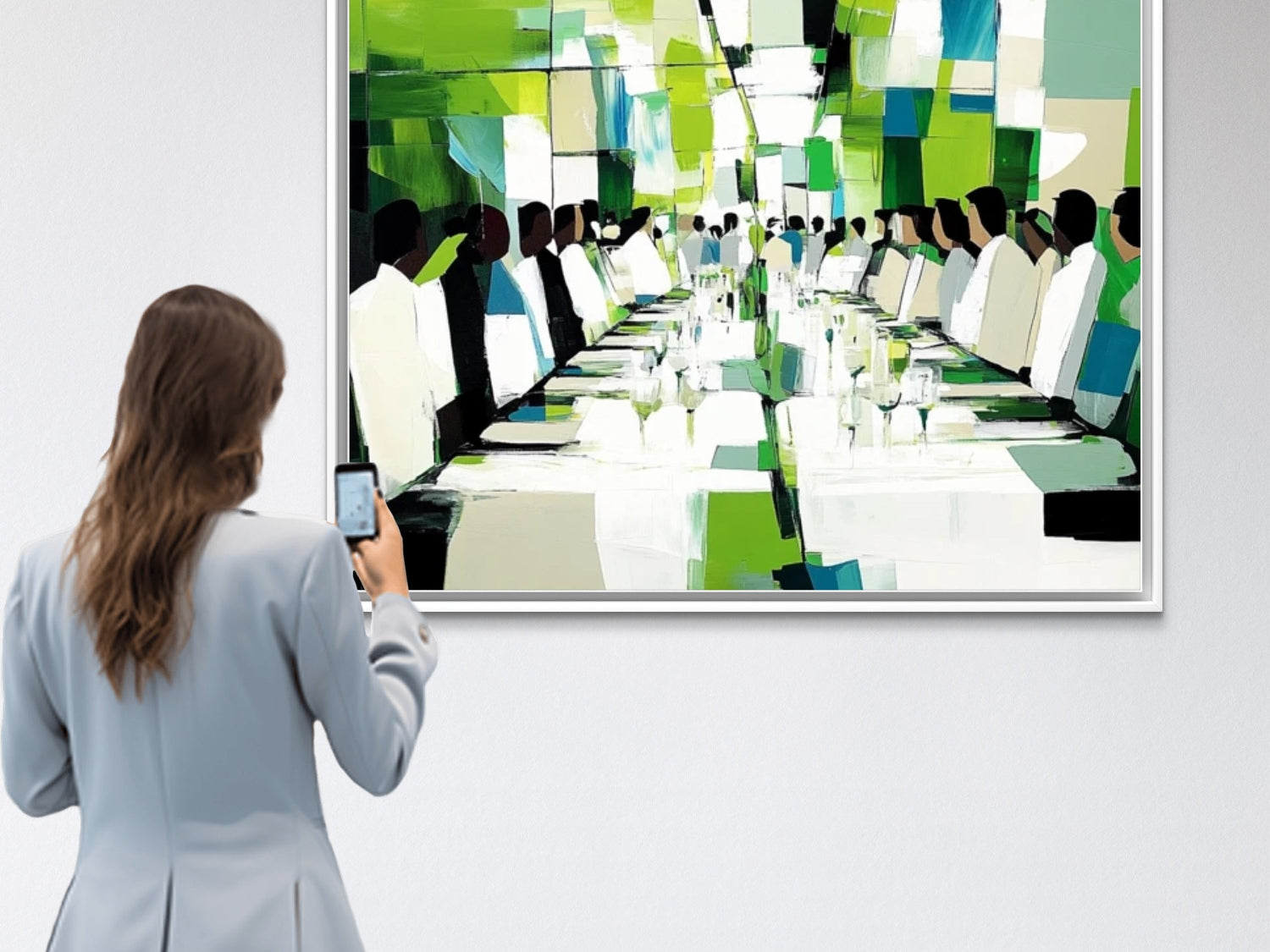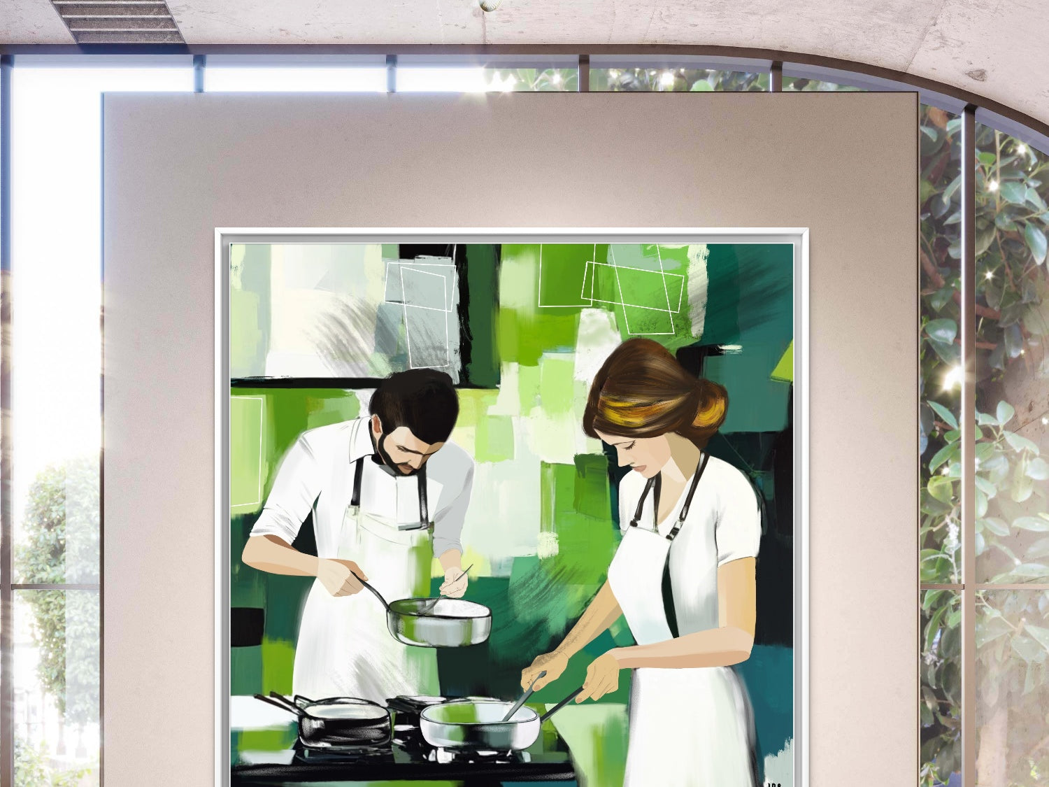 Each canvas captures people in everyday moments — cycling through city parks, tending rooftop gardens, choosing reusable goods — revealing the quiet revolution of sustainable living. The green dominance is more than an aesthetic choice; it serves as a visual metaphor for growth, renewal, and responsibility.